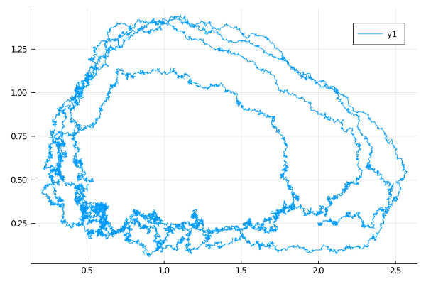 Note that we had to pass additional variables t, T and vT even though they are immaterial to the auxiliary law. The reason for this is that we defined LotkaVolterraAux in such a way that it is already fully compatible with GuidedProposals.jl and may be passed as an auxiliary law (and auxiliary laws currently require presence of fields t, T and vT). However, in practice, when dealing with LotkaVolterraAux, the internal states of t, T and vT are never used.